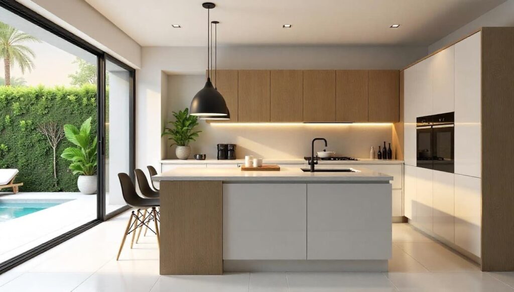 Ya sea mediante islas centrales, barras tipo snack o composiciones lineales sin tiradores, el objetivo es lograr continuidad visual. Eliminar las barreras físicas —y visuales— favorece el confort, la iluminación natural y la sensación de amplitud.
